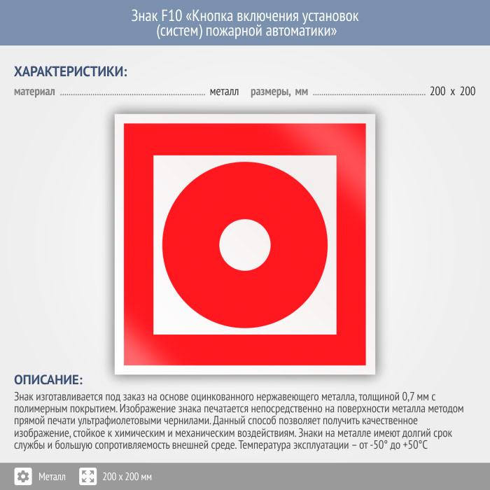 Знак F10 «Кнопка включения установок (систем) пожарной автоматики» (металл, 200х200 мм) в Ульяновске купить
